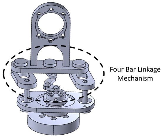 The rotation is achieved using a symmetric four-bar linkage driven by a motor coupled to the input link. The mechanism comprises:
