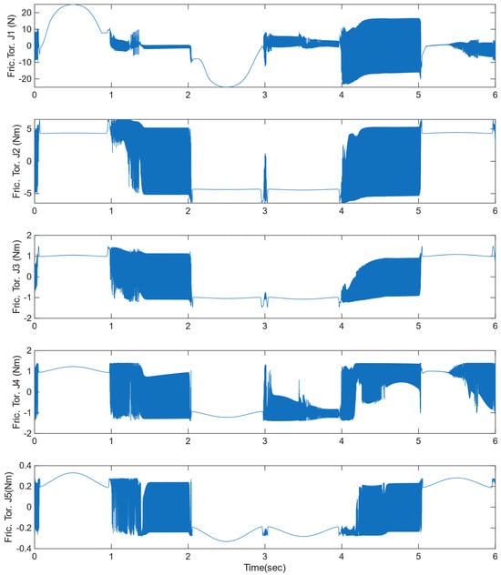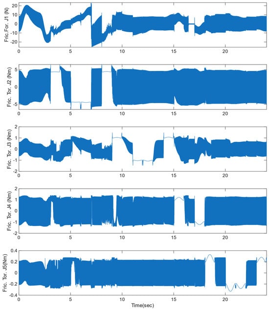 Friction modeling addresses the nonlinear resistive forces arising from joint interfaces, actuators, and transmission elements. In this study, the LuGre dynamic friction model is implemented to capture both static and dynamic friction characteristics, including Stribeck effects, pre-sliding displacement, and velocity-dependent behavior. Precise friction modeling is particularly important for replicating human-exoskeleton interactions during low-velocity transitions, such as gait initiation or postural adjustments.