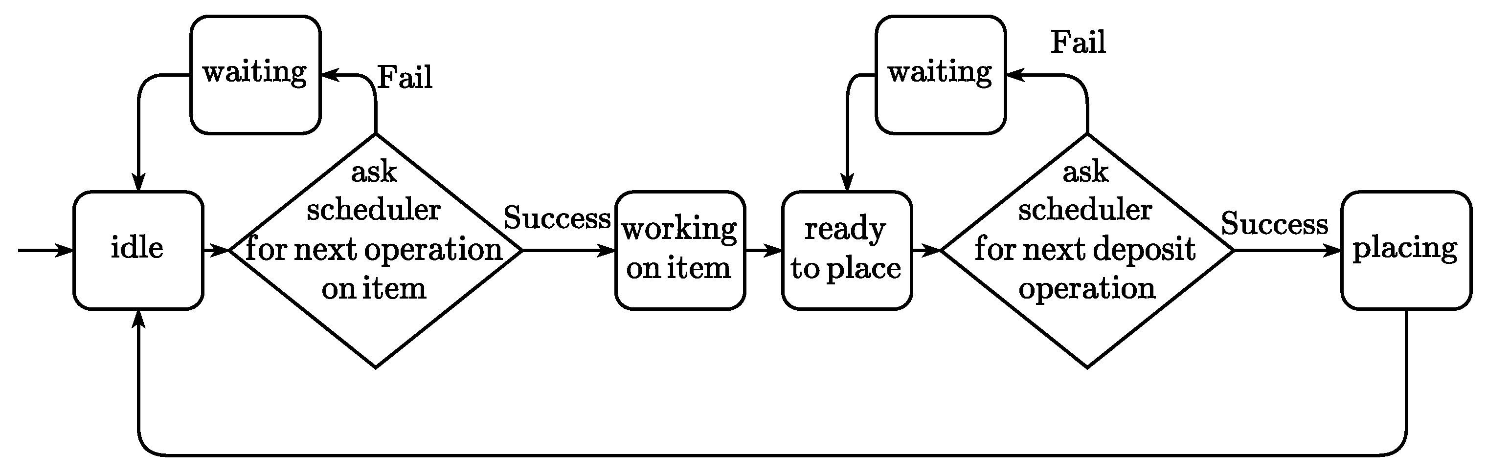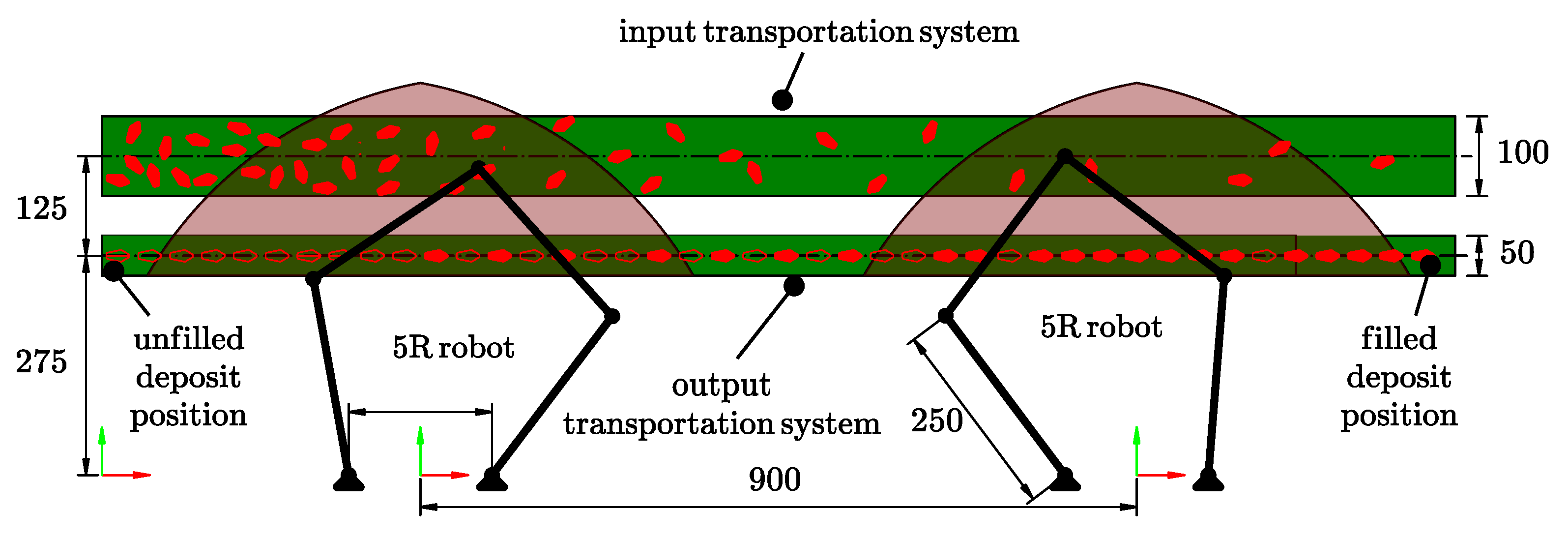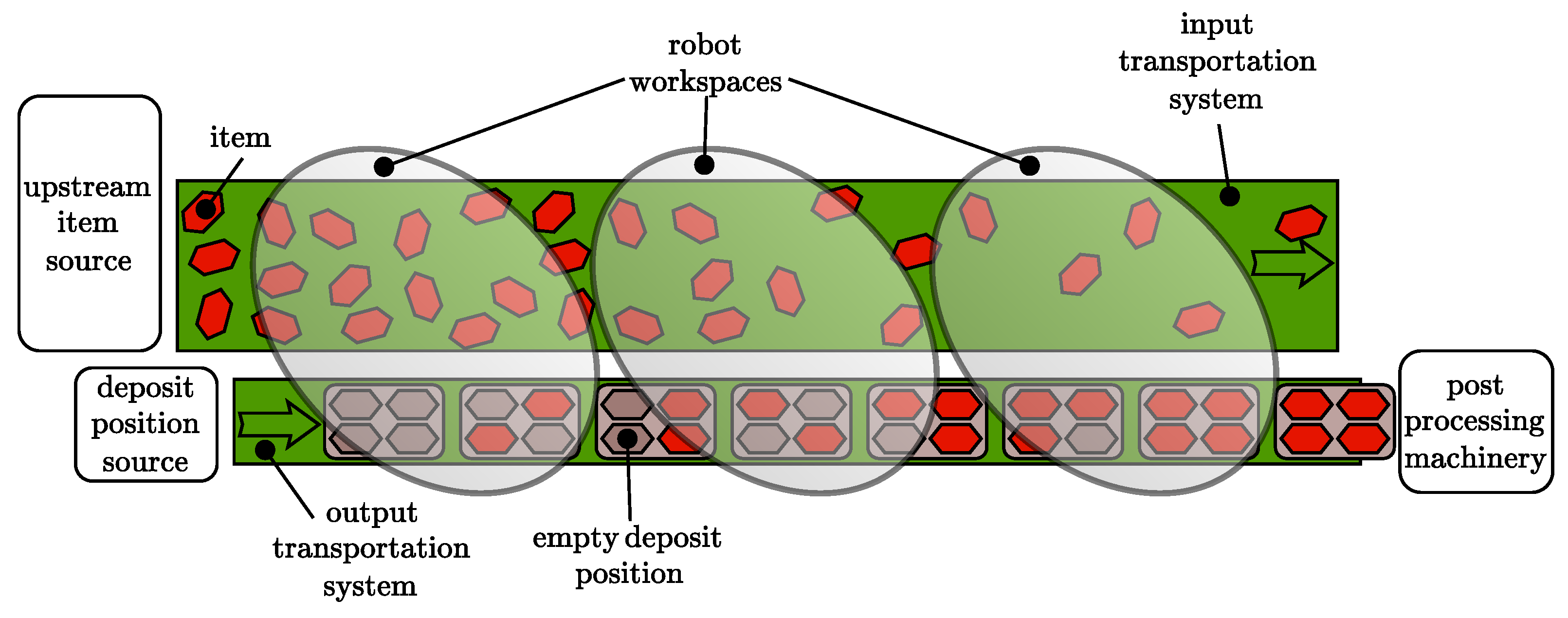 The focus of this work is mostly placed on the middle section, i.e., on the multi-robot system. Within this plant section one transportation system—the input one—is placed at the outlet of the upstream production facility, which generates the items and hence the input stream. The output transportation system is (materially or virtually) loaded at regular intervals with empty deposit positions that are to be filled by the robots; the output stream then terminates at the inlet section of the downstream machinery, which accepts the sorted items and proceeds with their further processing.