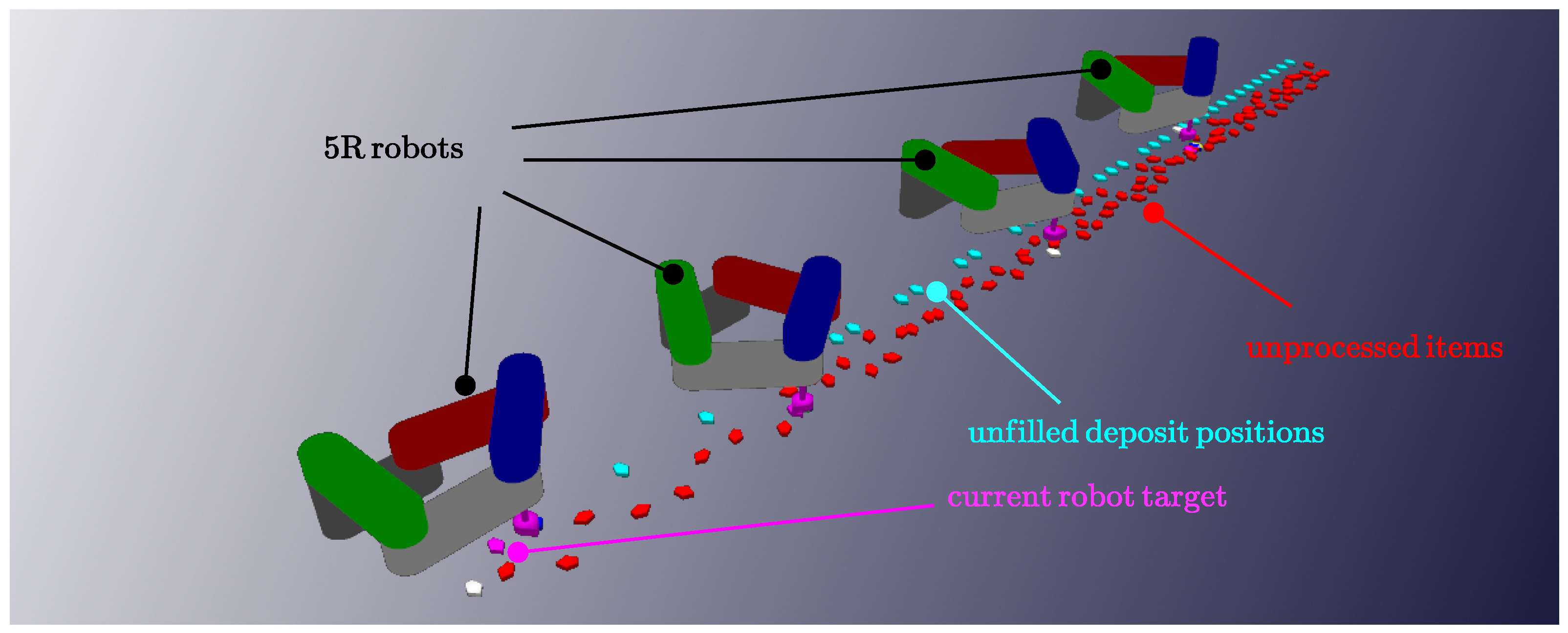 In the following subsection, to establish a few base cases, some simulations that do not rely on the rollout algorithm are presented at first. All feature four robots, and conveyors moving at speeds set at their nominal values: and .