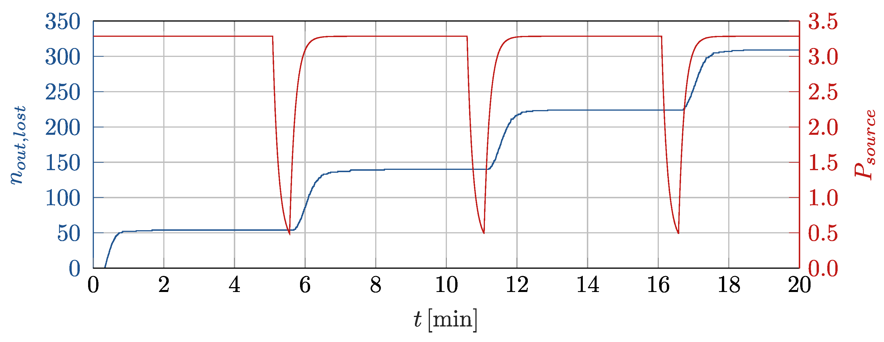 A rollout window of appears insufficient to achieve the desired result, as there is a loss of deposit positions even with a high number of discarded items. Case (5b), on the other hand, achieves a desirable result of no loss of deposit positions, with a moderate loss of items. Even better results are obtained in case (5c), which further reduces the number of lost items at the price of a higher computational cost. Case (5d), which is characterized by the highest , is less favorable than cases (5b) and (5c); this might be explained by the fact that the rollout simulations project forward the instantaneously observed upstream production rate, and do not assume anything about the future trends. Accordingly, after a certain point longer and longer forward predictions may lose accuracy and lead to the selection of the wrong action.
