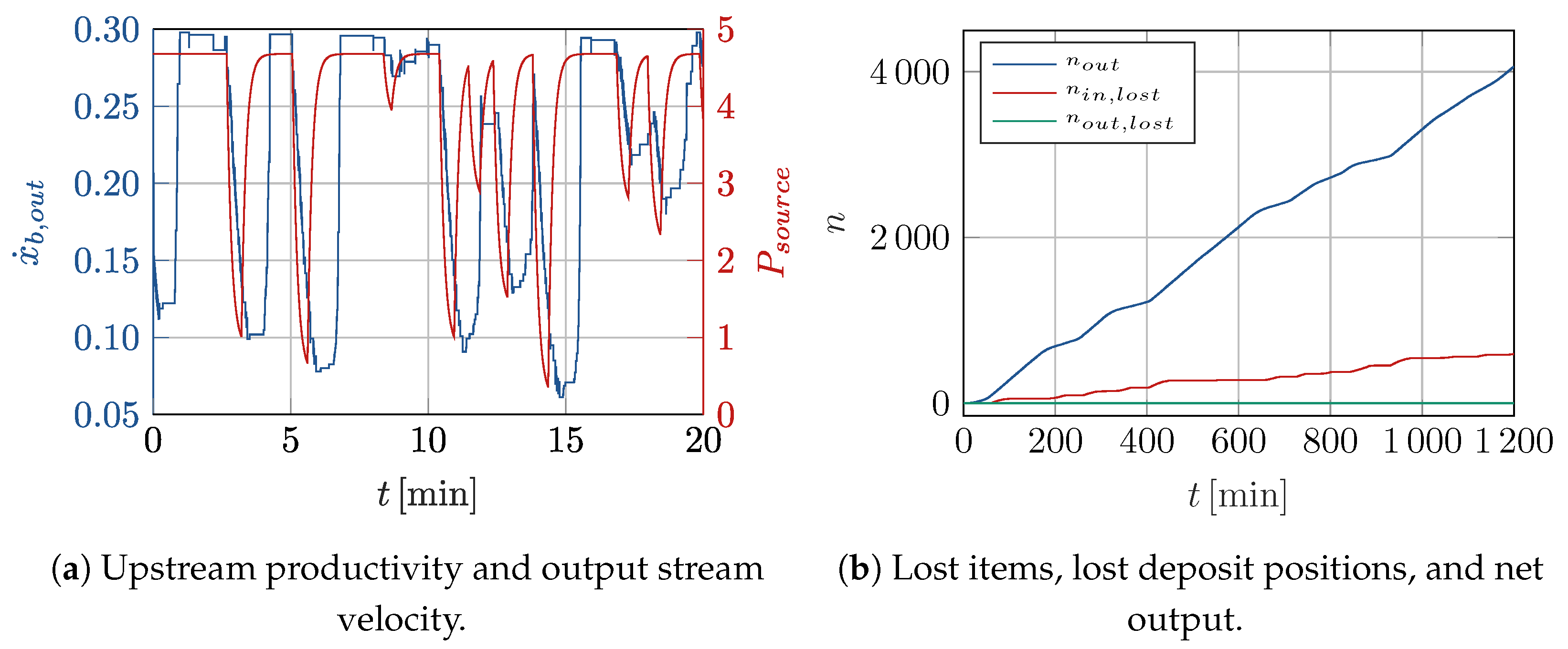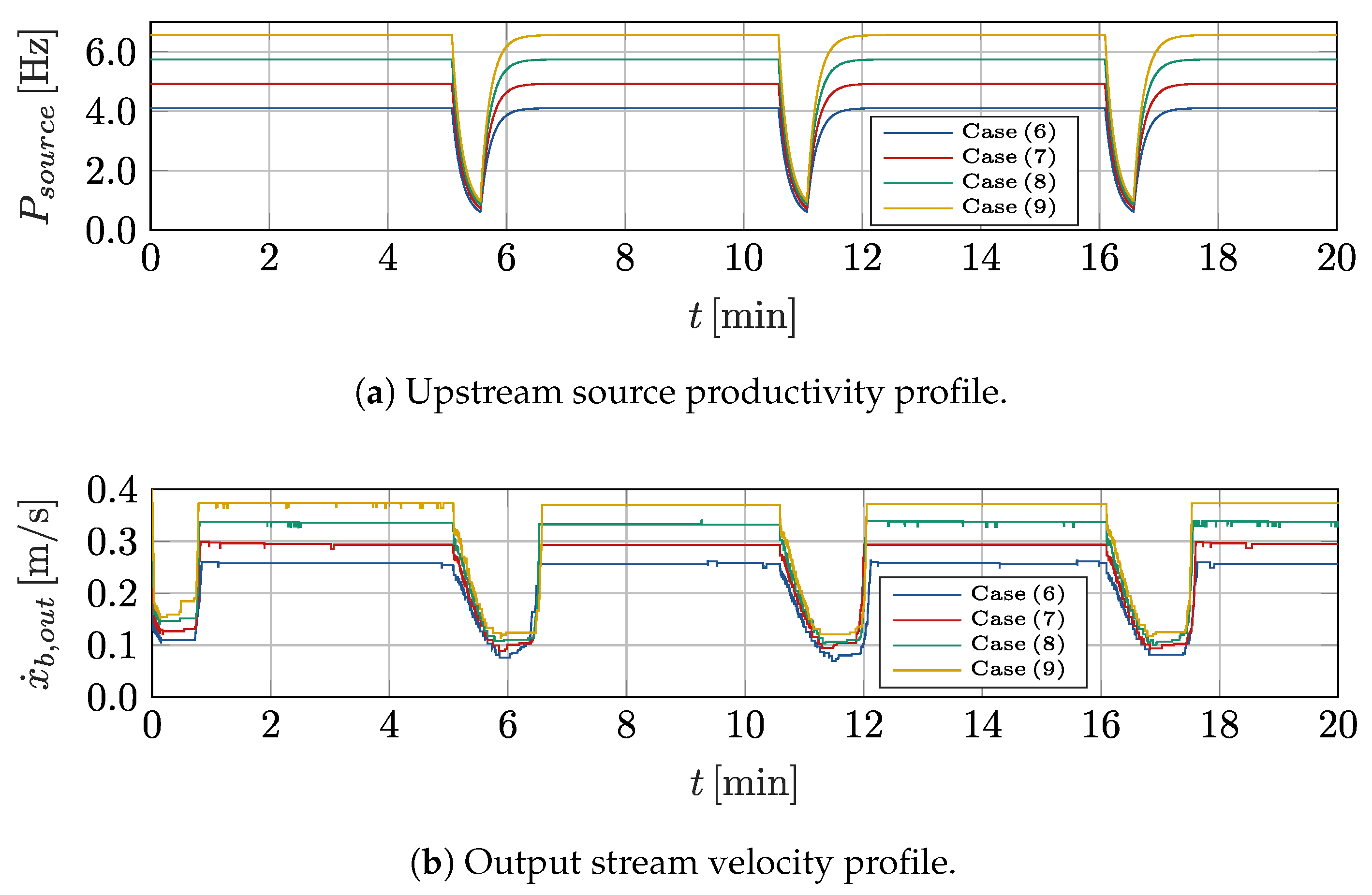 Figure 12a shows on separate axes the upstream source’s productivity profile and the output conveyor velocity as calculated by the rollout algorithm.