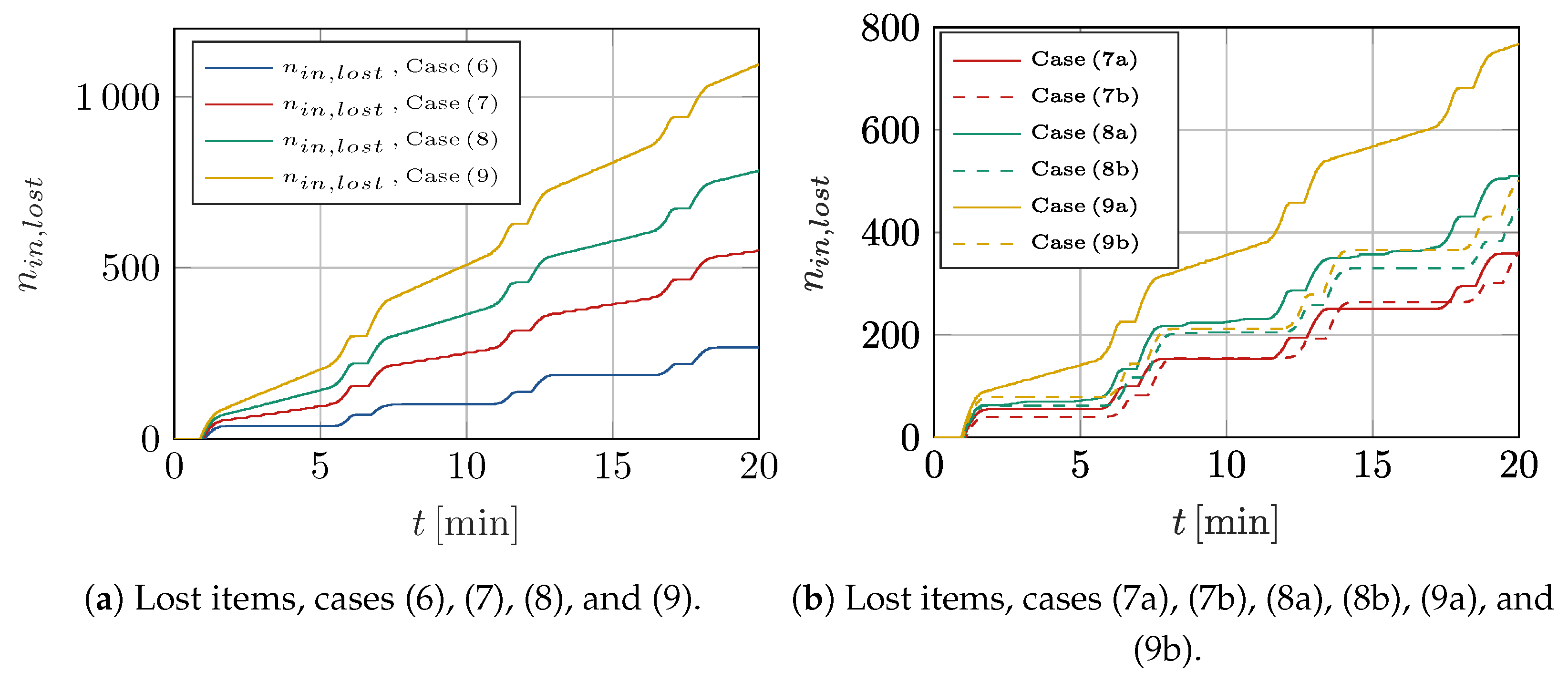 for cases (6), (7), (8), and (9), it is evident that for plant (7), even in steady-state conditions, there is a roughly uniform trickle of lost items; these losses become increasingly marked for plants (8) and (9). This suggests that the productivity of the upstream item source cannot be linearly scaled with the number of the robots. Variants with lowered peak upstream productivities were therefore analyzed. In particular, compared to cases (7), (8), and (9), a 5% reduction was applied to yield cases (7a), (8a), and (9a). Cases (7b), (8b), and (9b) were analogously obtained considering a 10% reduction. The time history of the lost items is reported in