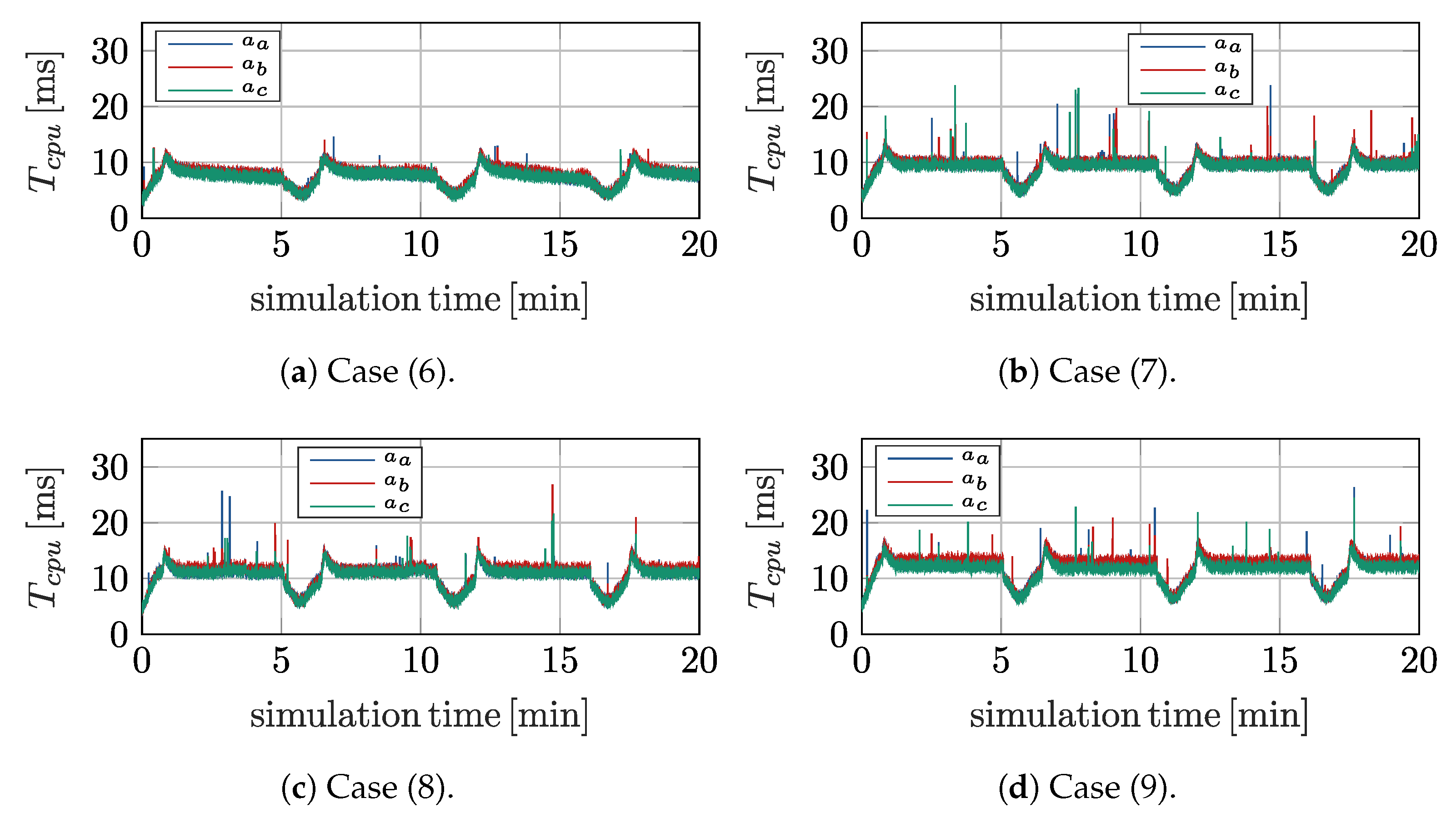 Despite these caveats, it may be stated that the proposed method in its current implementation is entirely suitable for real-time use in many cases of practical interest. To substantiate this claim, the computational costs of running a rollout scenario for for the plants considered in cases (6), (7), (8), and (9) have been recorded.