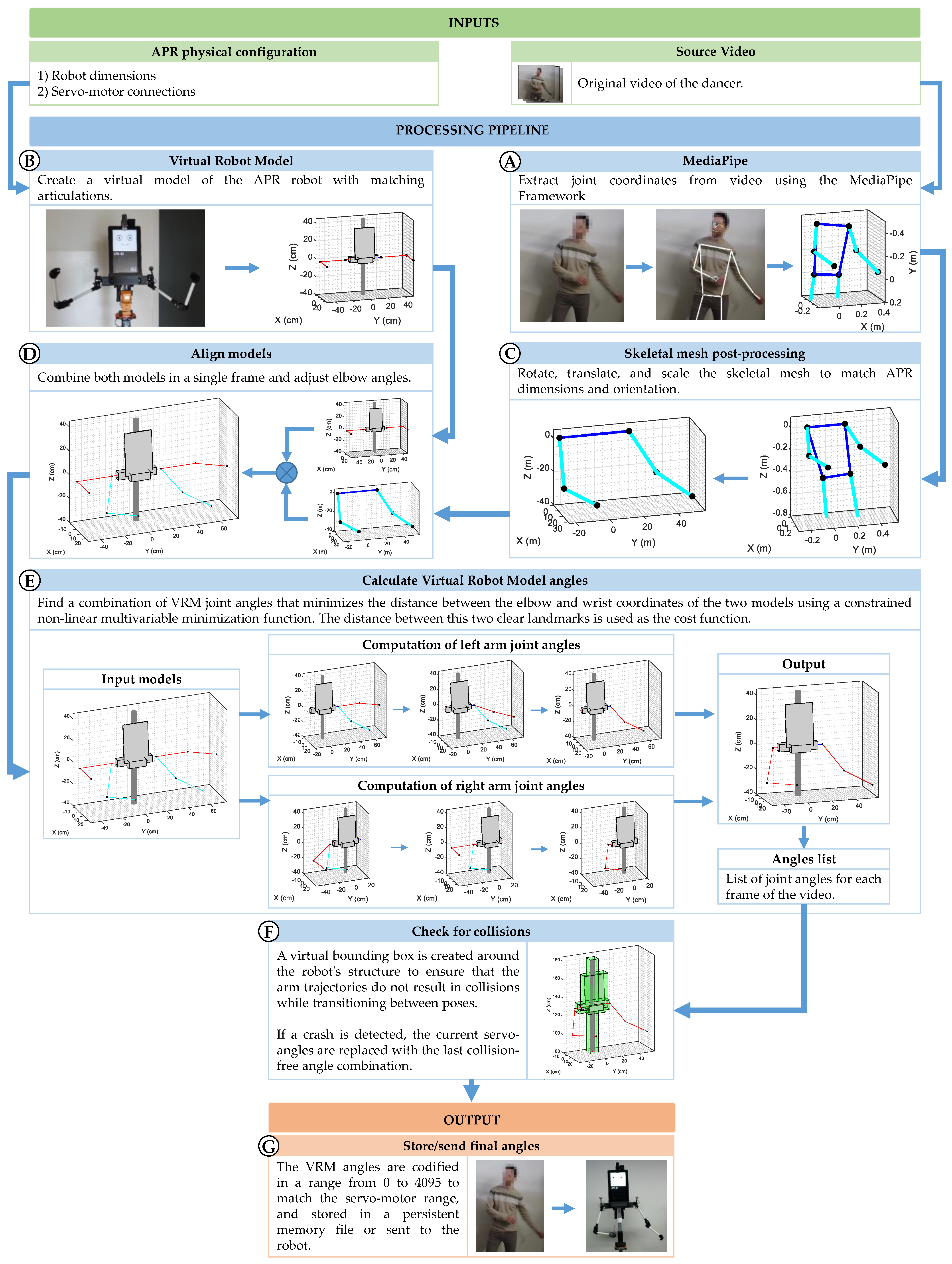 - The development of a virtual model for the humanoid robot and the application of a minimization function to match the skeletal mesh of the dancer and the angles of the arms of the virtual model;