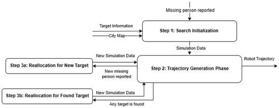 This section describes the proposed methodology for addressing the problem outlined above. An overview of the workflow is illustrated in Figure 1. In Step 1, we assume that ‘humans’ send a missing report to the search team, who in turn initiate the search, Section 3.1. In Step 2, a closed-loop phase that periodically updates the robot/UAV trajectories for the next iteration is initiated, Section 3.2. If a new missing person is reported or any target is found, all current searches are temporarily paused. In such a case, Steps 3a and 3b are triggered to review the data at hand and re-allocate resources before resuming the search(es), Section 3.3.