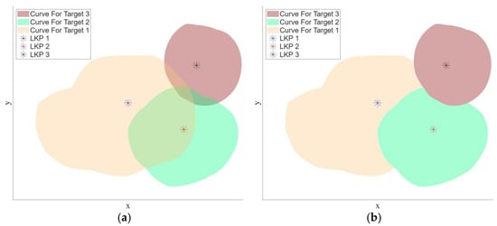 Figure 2b illustrates the outcome of this adjustment process. On the left, overlapping 100% iso-probability curves result in duplicated search regions. On the right, after applying Equations (4) and (5), the curves are “redrawn” to avoid overlapping.