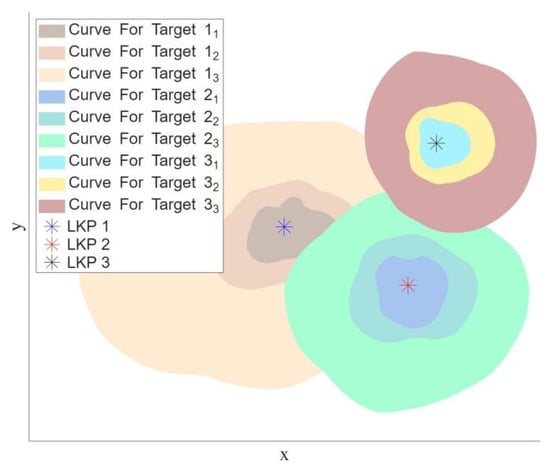 Let us assume that there are targets, each of which has an associated cumulative distribution function (CDF) that represents its set of iso-probability curves over time. For Target , this function is denoted as , where is the radial distance, is the direction, and is the time elapsed since the target was reported missing. These CDFs are, first, sorted based on their corresponding reporting times in ascending order. For each target, its is, then, modified to account for the previously assigned search regions of earlier Targets to .