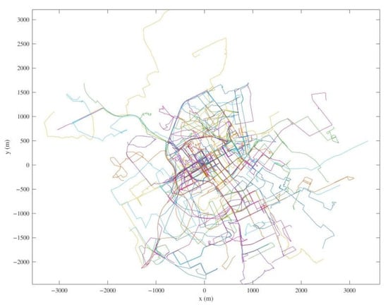 The urban/city missing-person behavior, utilized herein, is based on an extension of the model first introduced in []. It incorporates five key behaviors: random_traveling, consistent_traveling, route_traveling, direction_traveling, and backtracking into a unified, Monte Carlo–driven motion-prediction framework. This model simulates a large ensemble of possible trajectories and represents each as an iterative sequence of open polygonal segments. For every segment, the target follows a locomotion strategy and a decision-making strategy to either travel along a consistent heading or move randomly. Probabilistic transitions between these locomotion and decision strategies, including occasional backtracking, are controlled by model parameters calibrated from prior behavioral studies, enabling the prediction to capture both structured and exploratory human movements in dense urban settings. Unlike in [], herein, according to a building-entry model, every building footprint in our urban grid is treated as a “soft” obstacle that may temporarily shelter the missing person rather than merely deflect their path.