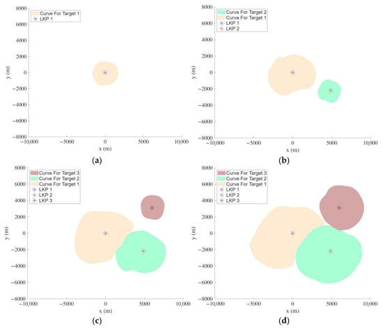 Figure A4a–d shows the 100% iso-probability curves for this six-target scenario at four different time points. The curves were determined based on a simulation of 10,000 possible target motions.