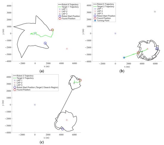 Three successful detection examples: (a) Target 2 was detected at t = 12,134 s, (b) Target 4 was detected at t = 11,146 s, and (c) Target 6 was detected at t = 11,228 s.