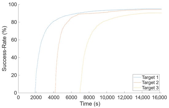 As noted above, in order to evaluate the performance of the proposed search method for this scenario, 10,000 simulated target trajectories were used. Figure A6 shows the (detection) success rate versus search time for both targets for a four-hour search window. For four hours of searching, a success rate of 97% was achieved for Target 1, 91% for Target 2, 92% for Target 3, 90% for Target 4, 90% for Target 5, and 92% for Target 6.