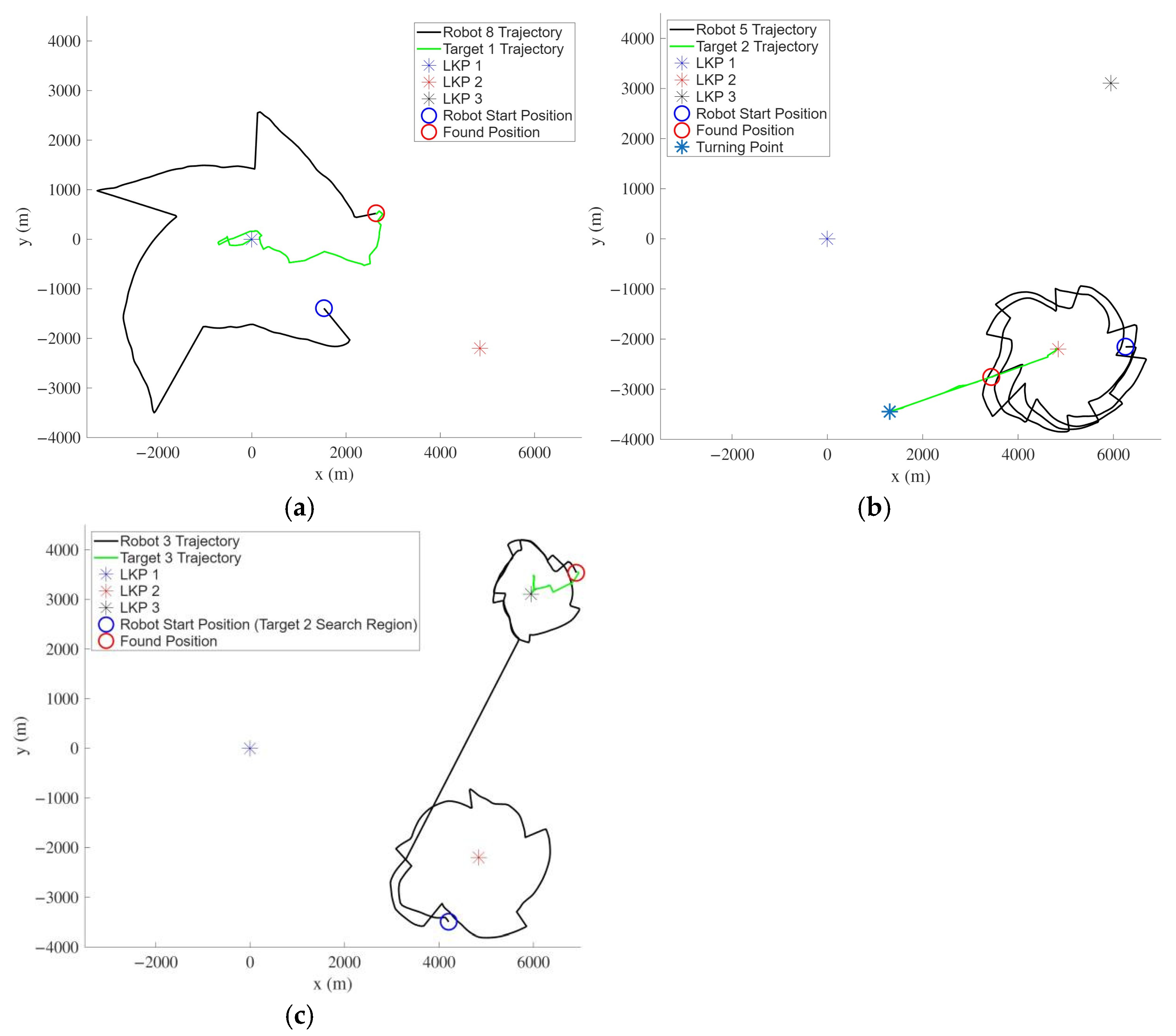 - At t = 6800 s, when the third missing target was reported, Search Task 3 was created. Consequently, the search was paused, once again, for reallocation of all robots: four robots (#1, 2, 3, and 9) were assigned to Task 3, one robot (#4) remained assigned to Task 2, and four robots (#5, 6, 7, and 8) remained assigned to Task 1. Three robots were kept in reserve for future use.