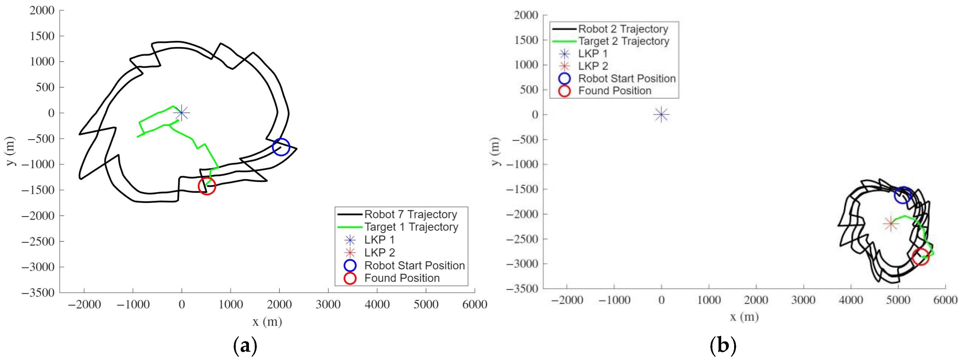 - At t = 3800 s, when the second missing target was reported, Search Task 2 was created. Consequently, the search was paused for reallocation of all robots: four robots (#5, 6, 7, and 8) were assigned to Task 2, and four robots (#9, 10, 11, and 12) remained assigned to Task 1. Four robots were kept in reserve for future use.