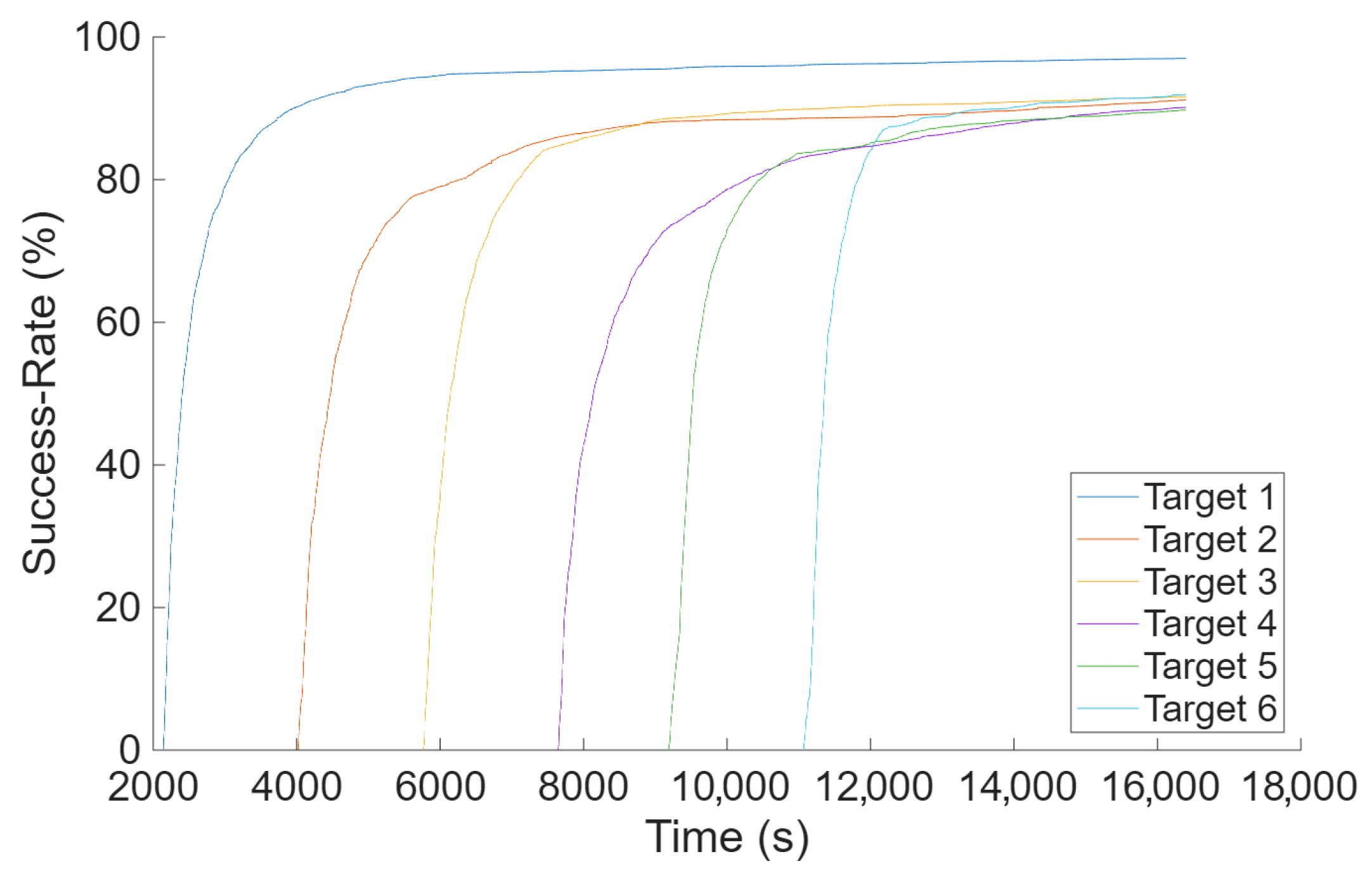- At t = 11,228 s, Target 6 was found. Consequently, the search was paused for reallocation of all robots: four robots (#7, 9, 10, and 12) remained assigned to Task 2, four robots (#1, 2, 5, and 6) remained assigned to Task 1. Two robots (7 and 9) moved to Station 2, and two robots (10 and 12) moved to Station 3.