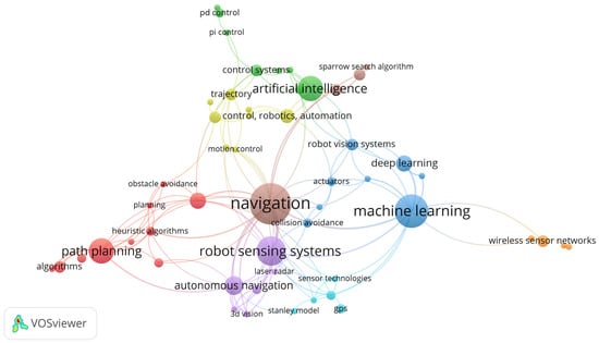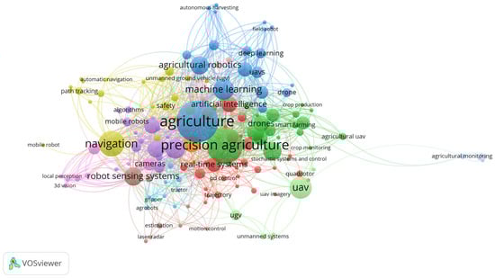 Bibliometric networks for the selected studies were created and visualized using the VOSviewer (version 1.6.20) software (https://www.vosviewer.com/, accessed on 15 January 2025), which provides network, overlay, and density visualizations [10,11,12]. In this analysis (Figure 3), twelve distinct clusters were identified, represented by colours including green, light green, purple, red, pink, soft pink, blue, light blue, orange, yellow, brown, and sky blue. The central node, “agriculture,” emerged as the most prominent and interconnected node in the network, closely linked to terms such as “agricultural robotics,” “machine learning,” “deep learning,” “field robot,” and “uavs.” Precision agriculture, followed by navigation, and robot sensing systems, emerged as the next prominent node, closely linked to terms such as “ugv,” “uav,” “path tracking,” and “motion control.” This interconnectedness highlights the role of agricultural robotics and its associated technologies in agriculture, particularly in precision agriculture-related applications such as smart farming and crop monitoring. A total of 153 keywords were identified in the analysis, each appearing at least twice. Applying the association strength method, the analysis illustrates the interconnected structure of research themes and emphasizes the prominent role of sensing, control, and networking technologies in agricultural robotics research.