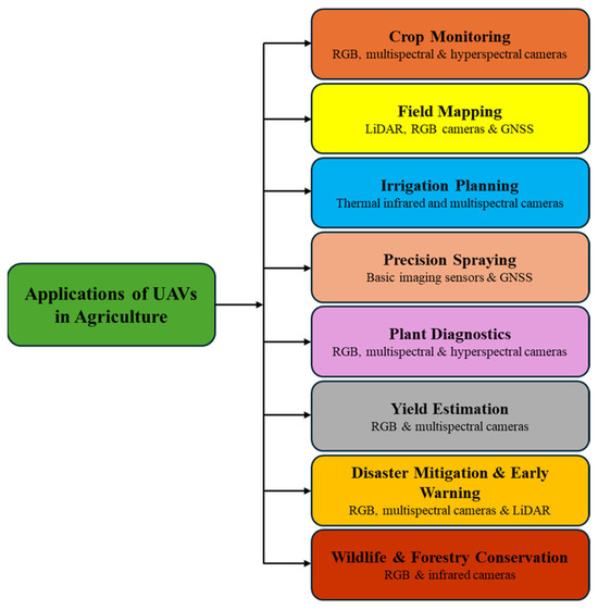 The integration of UAVs into farming practices has significantly improved efficiency, reduced costs, and enhanced profitability for farmers. UAVs, when combined with advanced computing systems and on-board sensors, play a critical role in crop management tasks such as field mapping, crop health monitoring, irrigation planning, plant diagnostics, disaster mitigation, early warning systems, and even wildlife and forestry conservation [18,19]. Furthermore, their cost-effectiveness, operational versatility, and ability to capture high-resolution data make UAVs ideal for applications such as crop growth assessment, water stress detection, precision irrigation, yield forecasting, and targeted management of weeds, pests, and diseases [20,21]. Spraying pesticides and fertilizers is one of the most straightforward applications for UAVs [22,23]. By utilizing UAV-based spraying systems, farmers can minimize direct human exposure to hazardous chemicals such as pesticides and fertilizers, thereby improving safety and reducing health risks [24]. Beyond spraying, UAVs enable more accurate, frequent, and cost-effective crop monitoring, delivering high-quality, up-to-date data that supports informed decision-making, identifies inefficiencies, and promotes improved crop management. Additionally, UAVs equipped with multispectral imaging sensors can capture detailed crop images, which are then analysed to monitor variations in plant structure, detect stress, and assess growth stages [25]. These capabilities make UAVs a valuable tool for both producers and agronomists, enhancing precision agriculture practices. Figure 5 illustrates the diverse applications of UAVs in modern agriculture and the required sensors. Several studies have explored the capabilities and functionalities of UAVs in carrying out agricultural tasks.