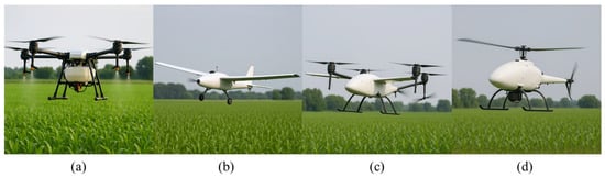 Agricultural UAV platforms: (a) Multi-rotor UAV, (b) Fixed-wing UAV, (c) Hybrid UAV (VTOL), (d) Unmanned Helicopter. The figures included here are AI-generated figures.