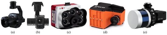 UAV-mounted sensors: (a) RGB camera (DJI Zenmuse P1, DJI, Shenzhen, China), (b) Thermal camera (Teledyne FLIR VUE TV128 Payload, Teledyne FLIR, Wilsonville, OR, USA), (c) Multispectral camera (MicaSense RedEdge-P, MicaSense, Seattle, WA, USA), (d) Hyperspectral camera (Specim AFX10, Specim, Spectral Imaging Ltd., Oulu, Finland), (e) LiDAR (RESEPI Velodyne VLP-16, Inertial Labs, Paeonian Springs, VA, USA).