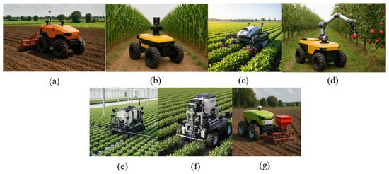 Applications of agricultural UGVs: (a) soil preparation, (b) crop monitoring and phenotyping, (c) robotic weeding, (d) harvesting, (e) plant treatment, (f) precision fertilizer application, (g) automatic seeding. The figures included here are AI-generated figures.