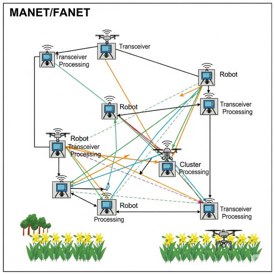 To achieve optimal operational performance, agricultural robots require high-performance control technologies, including reliable actuators and end-effectors. The control process typically involves planning a movement path based on a defined trajectory, guiding the robot’s actuators to avoid obstacles and reach the target location, and then using the end-effectors—assisted by sensors—to perform the necessary tasks with flexibility. Given the complex and ever-changing conditions in agricultural environments, accurate navigation and motion control have become critically important [4]. Common control strategies employed in agricultural robotics include classical control methods, intelligent control approaches such as fuzzy logic, and nonlinear control techniques. Robotic modules typically communicate either through physical links or wireless signals, allowing for effective coordination and collaboration among them. Communication, both between individual modules and across multiple robots, is crucial for achieving coordinated actions and scalable solutions in agricultural operations. Various communication architectures are designed to enhance teamwork among robotic systems, supporting the efficient completion of field tasks [5]. These communication and control technologies play a vital role in advancing multi-robot systems, broadening their use in agricultural automation and enhancing crop management strategies.