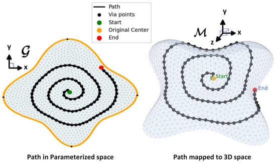 Once the surface is parameterized, a desired path is defined in the 2D domain. In this work, we chose a contour-parallel spiral path starting from the central point and expanding toward the boundary as shown in Figure 1. The generated path consisted of three spiral turns with a total length of 318.34 units and a step size of 3.2, with the center at (49.4, 49.4). The objective was not to emphasize the path design itself but to evaluate how different parameterization methods influenced the accuracy of transferring this path back onto the 3D surface. The 2D path consisted of a set of via points in , and each 2D waypoint was mapped to the original mesh through barycentric interpolation. For a given point inside a 2D triangle with vertices , barycentric weights were computed such that