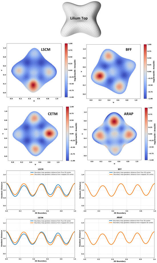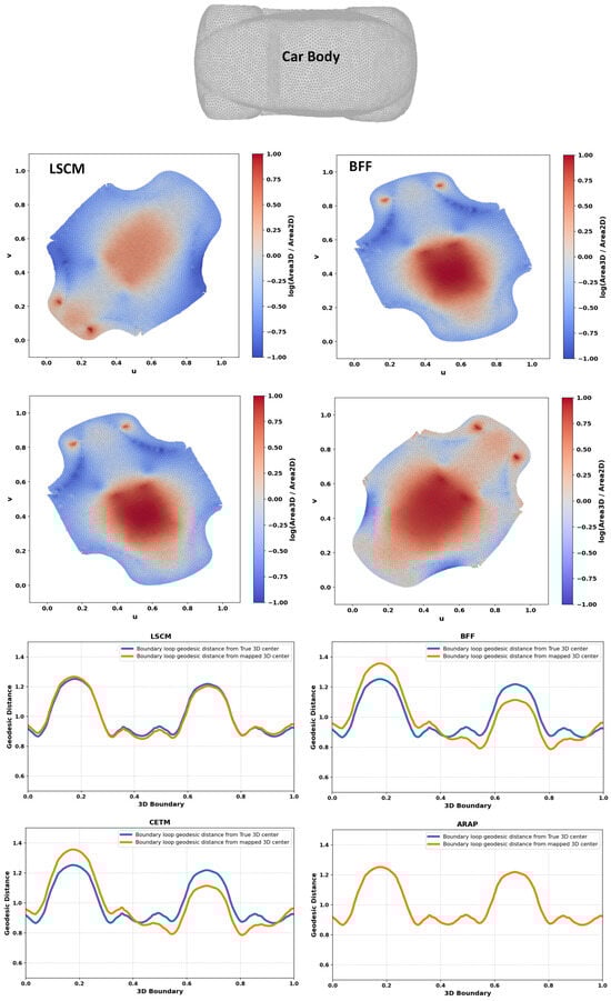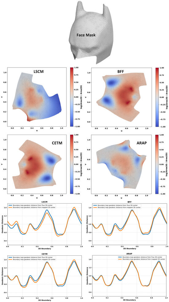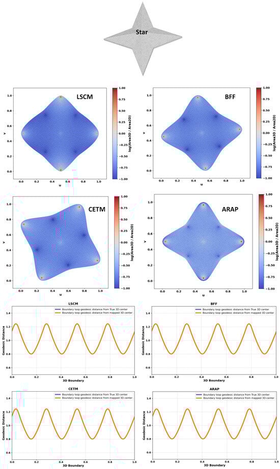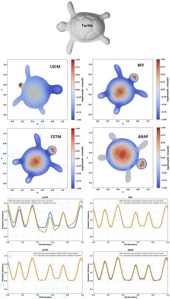 All experiments were implemented in Python 3.8.10 and carried out on a system running Windows 11, a 13th-generation Intel i9 processor, and 32 GB of RAM. We evaluated eight triangular meshes—Wash basin (10,902 faces, 5589 vertices), Turtle (7600 faces, 3954 vertices), Face mask (11,168 faces, 5735 vertices), Bumpcap (15,082 faces, 7641 vertices), Kitten face (31,954 faces, 16,195 vertices), Lilium top (1844 faces, 975 vertices), Four-sided star (5344 faces, 2801 vertices), and Car body (12,763 faces, 6517 vertices). Before parameterization, each input mesh was cleaned to eliminate geometric defects that could affect distortion analysis. The cleaning stage merged duplicate vertices and edges, removed degenerate or unreferenced faces, repaired inconsistent normals, and ensured manifold connectivity. The cleaned meshes were then processed using four parameterization solvers (LSCM, BFF, CETM, and ARAP). Each resulting UV layout was validated by checking (i) the positivity of the outer boundary area and (ii) the ratio of non-zero UV magnitudes. If either condition failed, the mesh was reprocessed and the parameterization repeated for a limited number of attempts. When valid mappings could not be obtained, isotropic explicit remeshing was applied to improve triangle regularity and solver stability, using the meshing_isotropic_explicit_remeshing filter in PyMeshLab configured with ten iterations, a crease angle of , and a target edge length of approximately 1–2% of the mesh bounding-box diagonal. The center-to-boundary geodesic deviation (CBGD) was then computed for all methods as defined in Equation (26). Distortion between the center and boundary in the 2D domain causes the back-projected parametric center to deviate from its true 3D geodesic position, altering the corresponding distances to boundary points in . This deviation reflects potential local over- or undersampling in the trajectory. Ideally, a parameterization preserves these center–boundary relationships, yielding near-symmetric sampling and a geodesic deviation approaching zero.