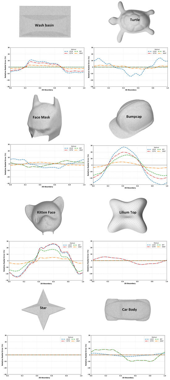 Figure 2, Figure 3, Figure 4, Figure 5, Figure 6, Figure 7, Figure 8 and Figure 9 shows the area distortion produced by the four parameterization methods (ARAP, BFF, CETM, and LSCM) together with the corresponding center-to-boundary geodesic distance deviation for each test object. Figure 10 shows the per-object geodesic deviation curves for all four methods. The error depended on local curvature and geometry. Bumpcap and Kitten face showed the largest, least-uniform errors, with LSCM having the highest peak. Objects with limited curvature variation and minimal bumpiness exhibited mild deviations. On smoother geometries, deviations remained moderate, with ARAP and BFF generally tighter and CETM and LSCM more variable. For Four-sided star, all methods performed almost perfectly, as its creased structure limited stretching/compression and preserved center alignment.