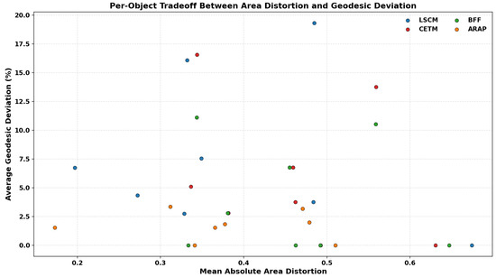 Absolute area distortion versus average geodesic deviation for the test meshes across the four parameterization methods (LSCM, CETM, BFF, and ARAP).