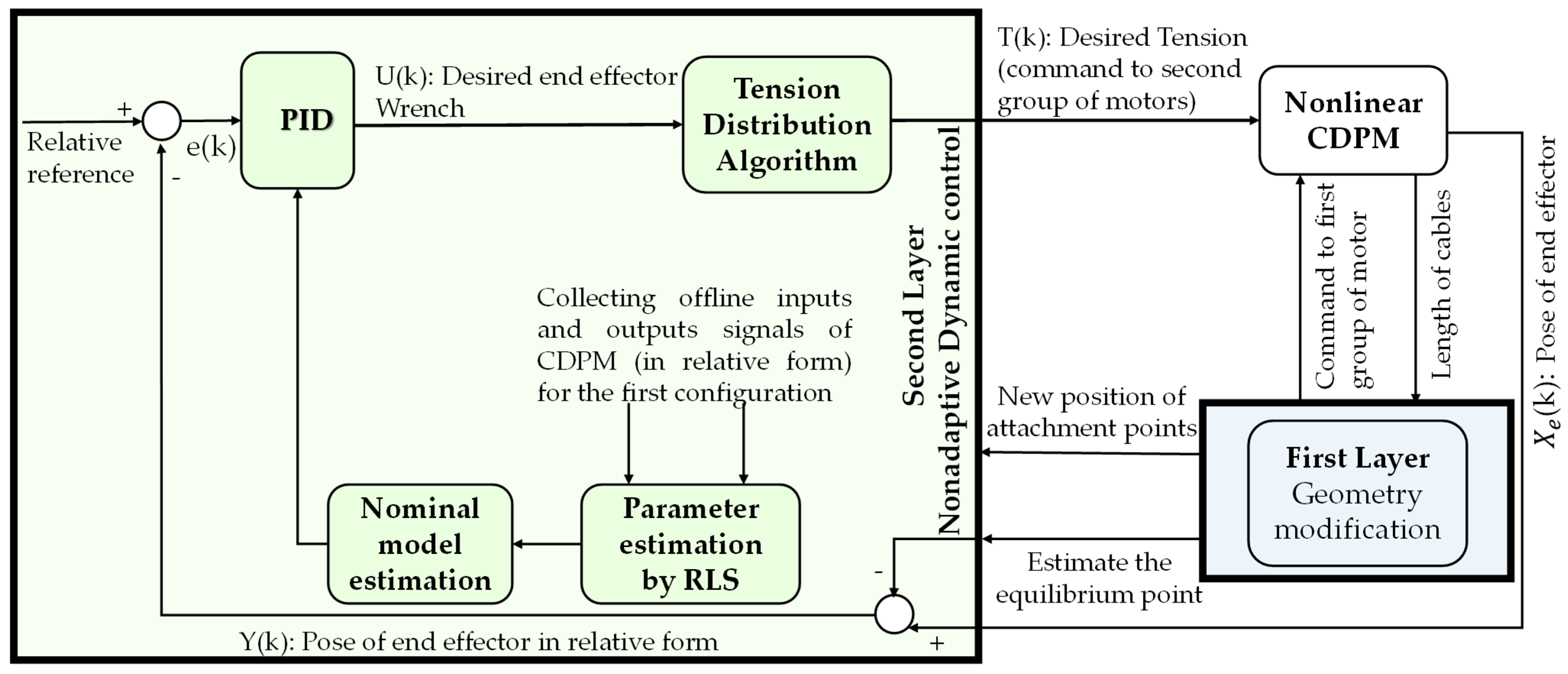| Choosing a safe distance by an expert Choosing a desired trajectory First layer: The main control loop steps of the first layer loop K1 ≤ 1 //Step time index Initializing for each step index K1 (K1 = 1 to N1) do: Step 1.1: Find the shortest distance between humans and cables by the KKT method presented in [13]. Step 1.2: Comparison between the safe distance and the calculated distance If the distance is higher than the safe distance, go to step 1.3. else if the distance is lower than the safe distance, go to the end for. Step 1.3: Estimate optimized attachment point positions to a safe position by solving the cost function. Step 1.4: Estimate the equilibrium point based on estimated new attachment points. Step 1.5: Transmit the optimized positions to the first group of servomotors for relocation. Step 1.6: Send the equilibrium point and new attachment points to the second layer. end for Second layer: The main non-adaptive control of the second layer loop (offline RLS + fixed parameters PID controller) Step 2.1 Gather outputs x(i,k) and inputs u(j,k) from the nonlinear or physical model with the initial position of attachment points (In the absence of real data, the data obtained from the nonlinear model in Equation (1) is used). Step 2.2: Receive equilibrium points from first layer (step 1.6). Step 2.3: Estimate end effector pose and input in relative form . Step 2.4: Estimate parameters of the nominal linear model from gathered u and x via offline RLS. The second layer uses offline RLS to estimate the unknown parameters of the nominal linearized model () at each time step. These parameters do not directly represent the coefficients M0, C0, K0, but rather include the parameters of ARX presented in the form of Equation (4). for each step index K2, (K2 = 1 to N2) perform the following: Step 2.5: Define the desired trajectory for the end effector at the step time K2. Step 2.6: Design PID for the nominal model based on offline RLS. Step 2.7: Estimate the optimal control force on the end effector. Step 2.8: Using the tension distribution algorithm to generate tension on the cables. Step 2.9: Transmit the tension to the second group of servomotors for tracking trajectory. end for | |