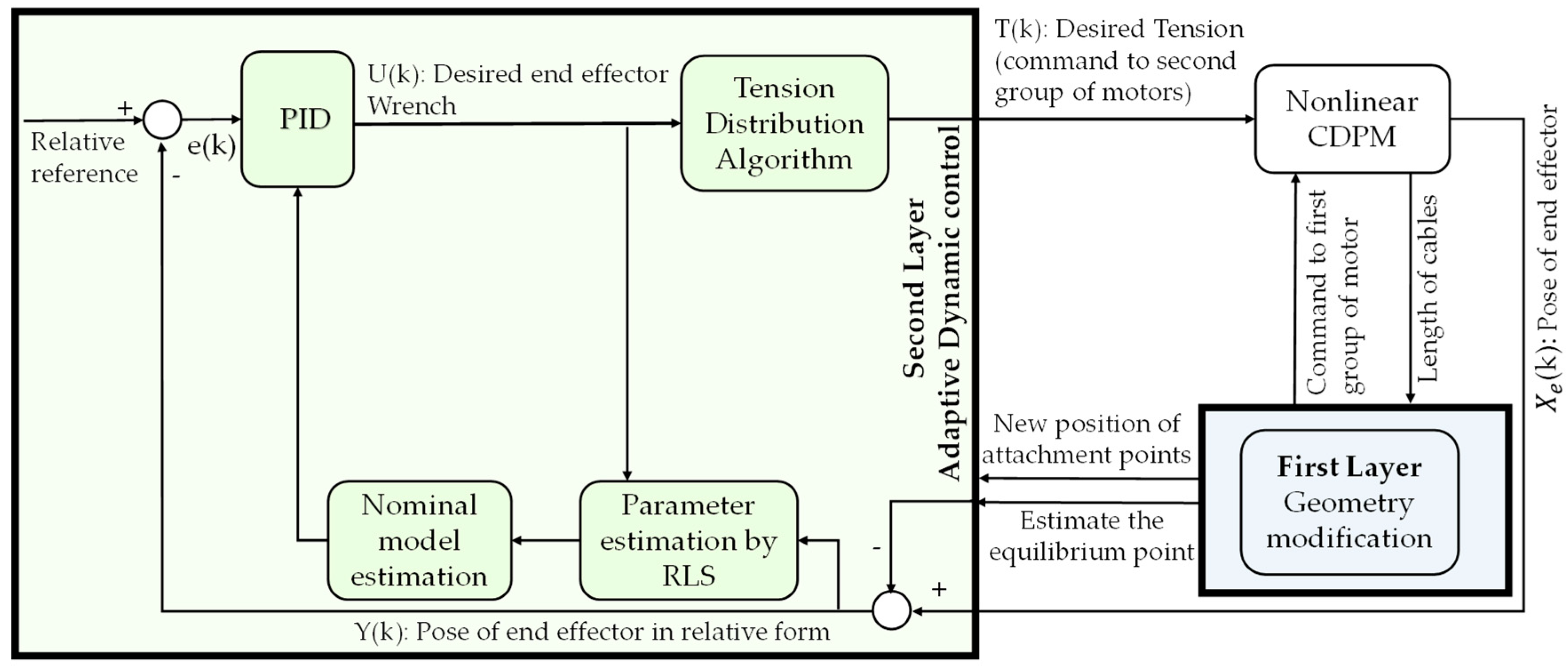 - Yoon, J.; Hwang, S.W.; Bak, J.-H.; Park, J.H. Adaptive control for cable driven parallel robots. In Proceedings of the 2017 17th International Conference on Control, Automation and Systems (ICCAS), Jeju, Republic of Korea, 18–21 October 2017; pp. 416–419. [Google Scholar]