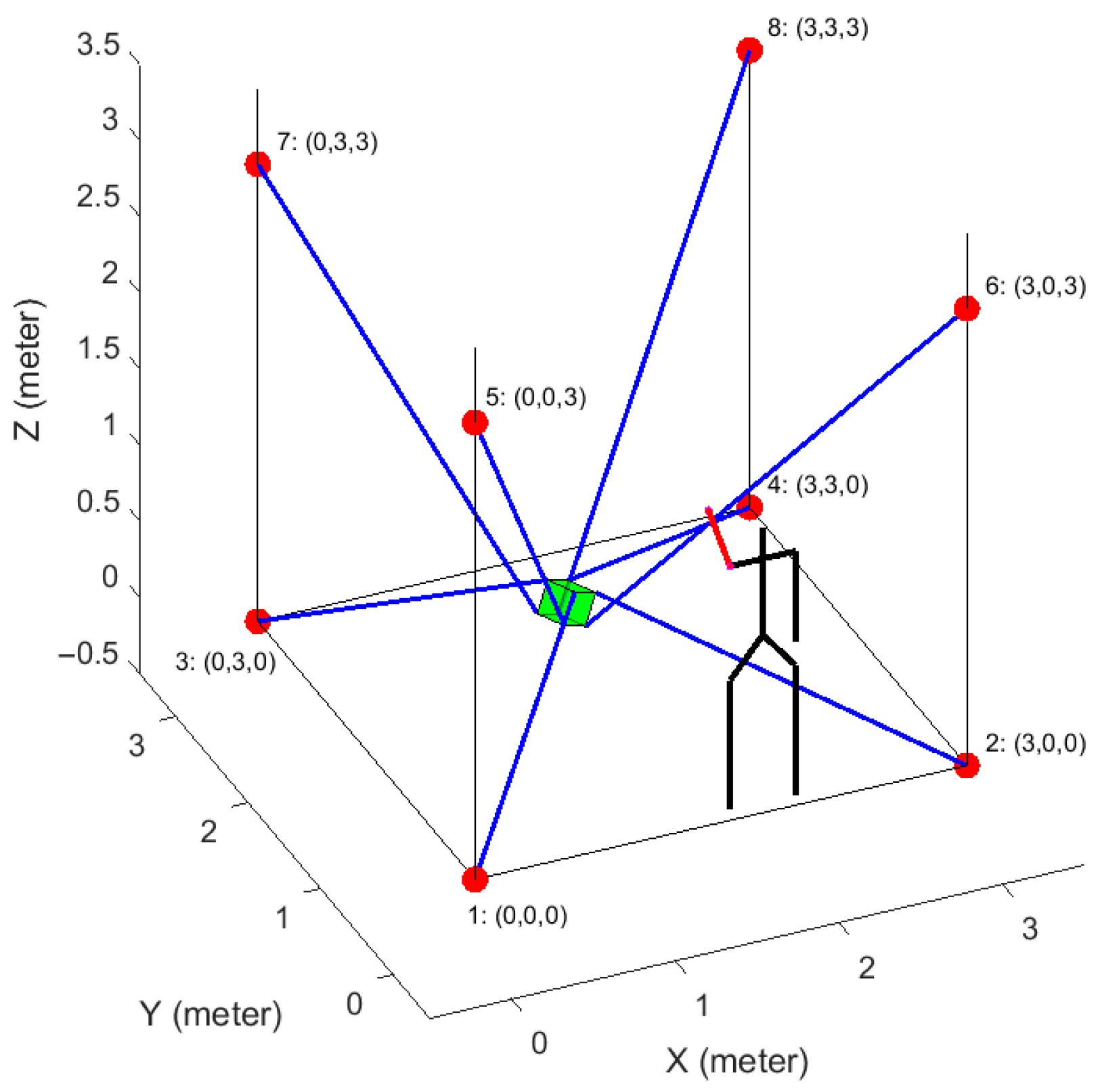 | Initialize: Set k ← 1 Initialize Attachment Points A ← For k = 1 to N do: Compute Shortest Distance () ← KKTsolver(, ) If < then Collision Risk ← True Else Collision Risk ← False End If //Check if end effector and cables are within workspace limits Compute tensions T ← TensionSolver(A,) If any(T <) OR any(T >) WorkspaceValid ← False L ← CableLengths(A,) If any(L < ) OR any(L > ): WorkspaceValid ← False # Singularities/poor conditioning J ← Jacobian(A, ) Else If det(J*J′) < epsilon WorkspaceValid ← False # Equilibrium proximity constraint If norm(, 2) > 0.5: return False If (Collision Risk = True) OR (Workspace Valid = False) Then //Adjustment Needed Solving function z_new ← Solve Optimization(Objective Function, Constraints) where Constraints include | |