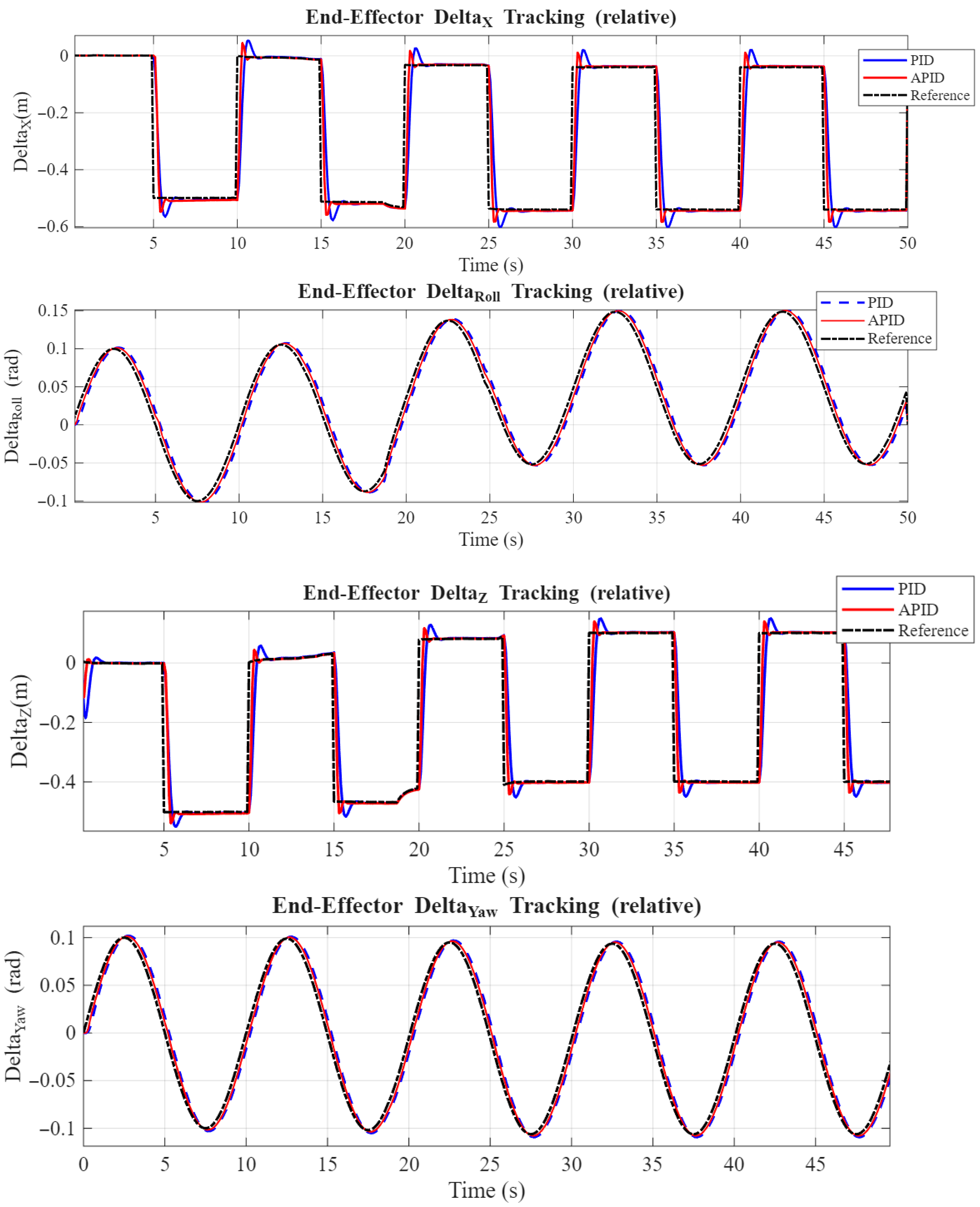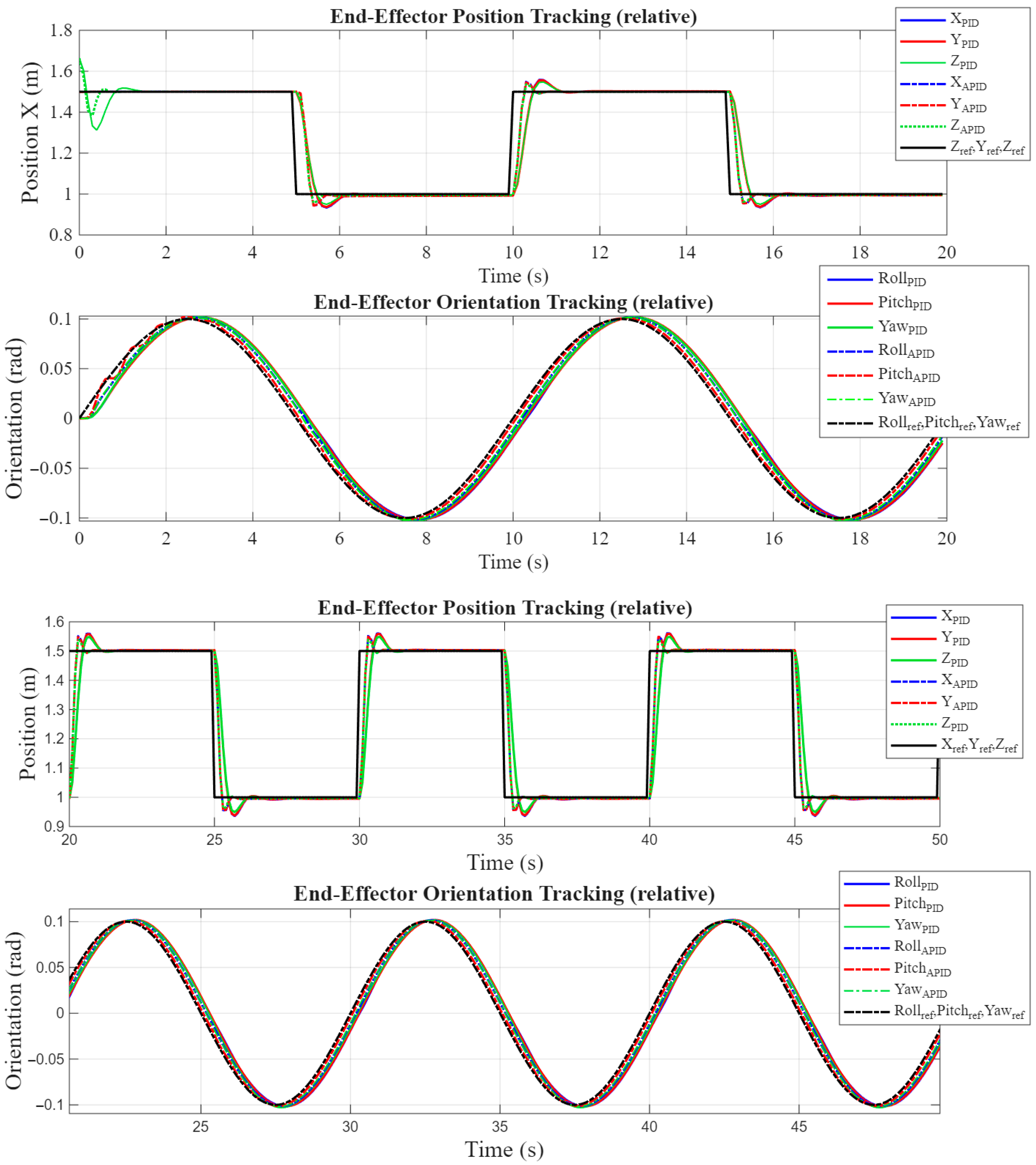 | 3. Model Uncertainty | Attachment points are moving AND the mass of the end effector is suddenly changed (e.g., ±0% mass). | To test the robustness of the APID’s RLS algorithm in estimating and compensating for unknown physical parameters. |