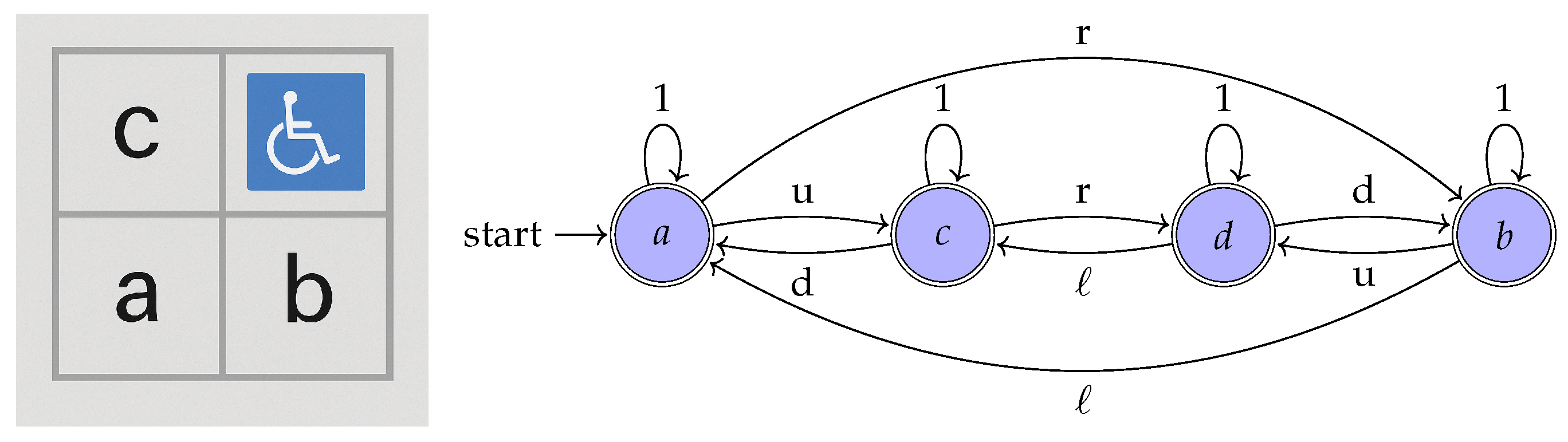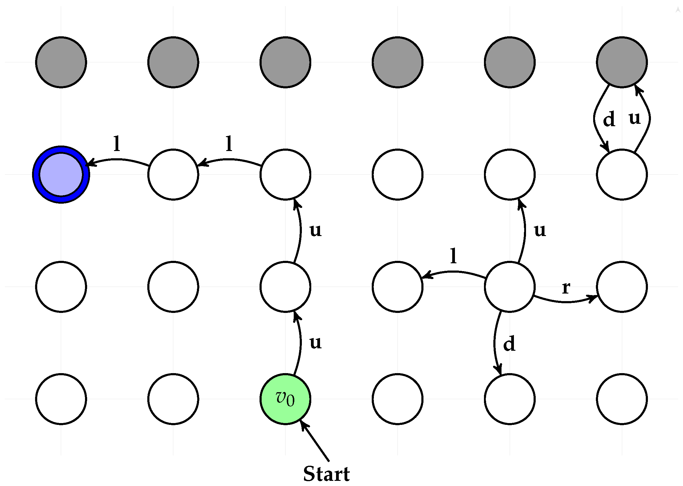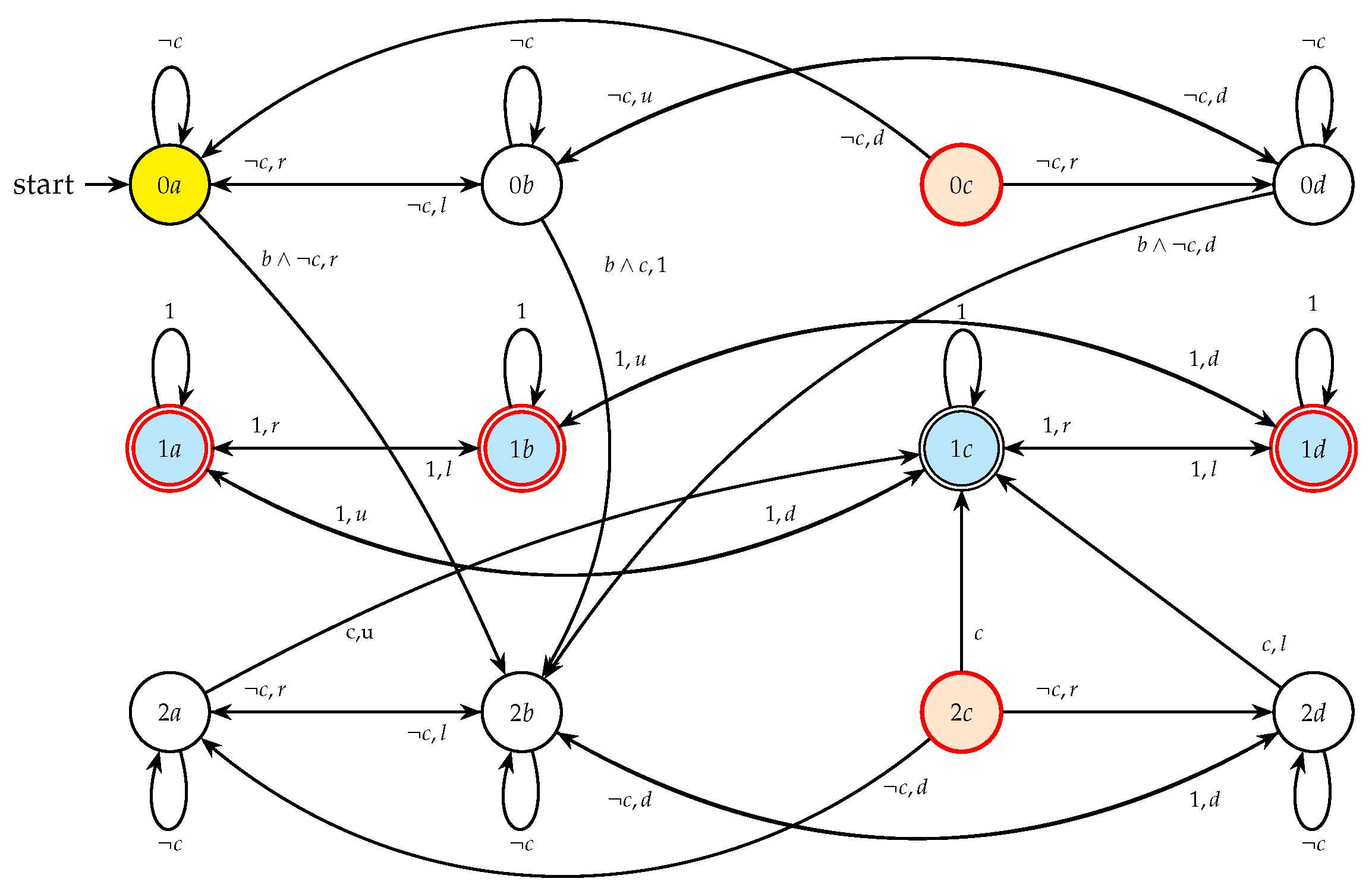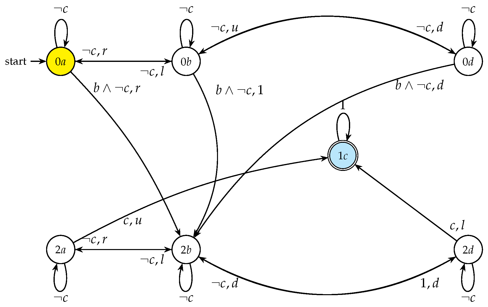 - Duret-Lutz, A.; Lewkowicz, A.; Fauchille, A.; Michaud, T.; Renault, E.; Xu, L. Spot 2.0—A Framework for LTL and ω-automata Manipulation. In Automated Technology for Verification and Analysis, Lecture Notes in Computer Science; Springer: Berlin/Heidelberg, Germany, 2016; Volume 9938, pp. 122–129. [Google Scholar] [CrossRef]