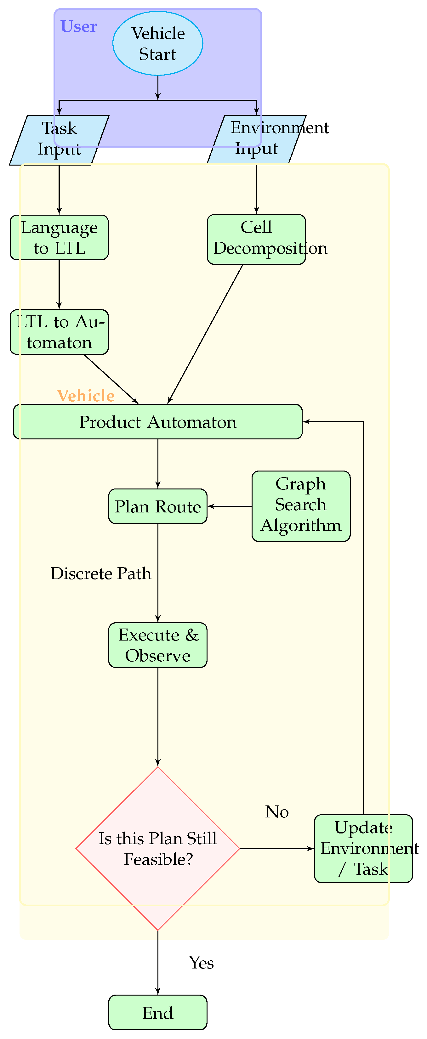 - Traditional Automata-Based Method: This method iterates through every environment state and task state to build the product automaton “from scratch” for . When the task changes to , it must discard its previous work and re-run the entire “from-scratch” iterative process.