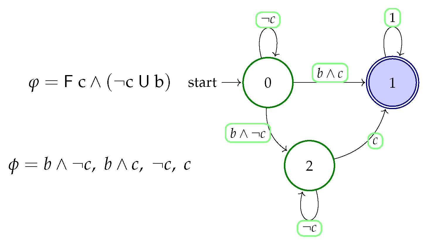 - If there exists a transition , where is a logical formula over atomic propositions (e.g., , ), then . This includes conditional self-loops when .