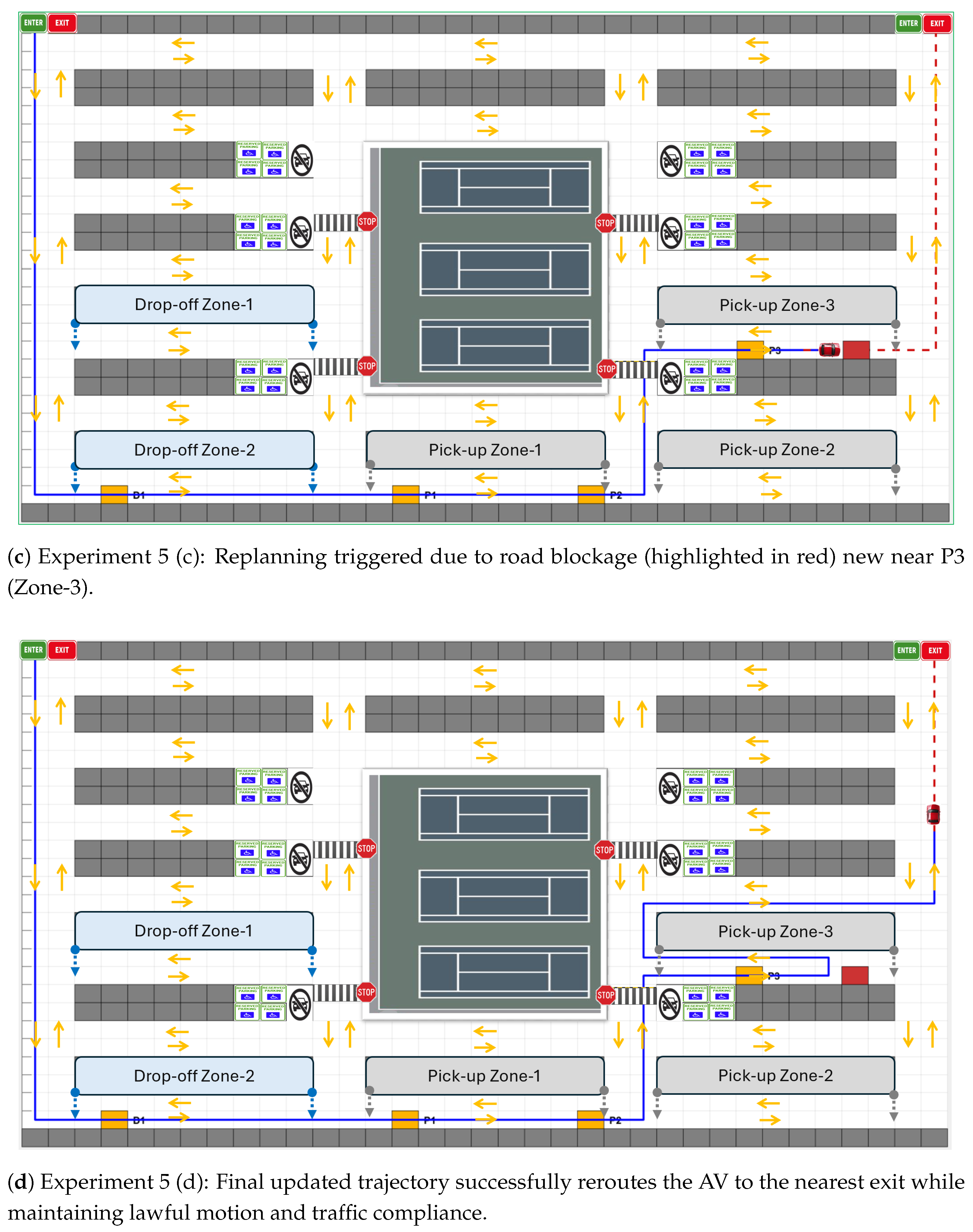 - Experiment 3: Dynamic goal change mid-mission due to a road blockage, evaluating the agility of the planner.