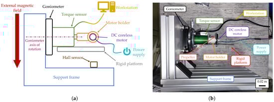 Experimental setup used to measure the torque exerted on the DC motor by the external magnetic field. (a) Schematic illustration of the apparatus. (b) Lateral view of the experimental setup.