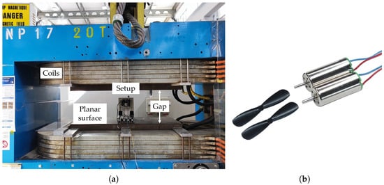 (a) The MNP17 electromagnet used to generate and control the magnetic field. (b) Photograph of the tested 7 × 16 mm brushed coreless DC motors with propellers.