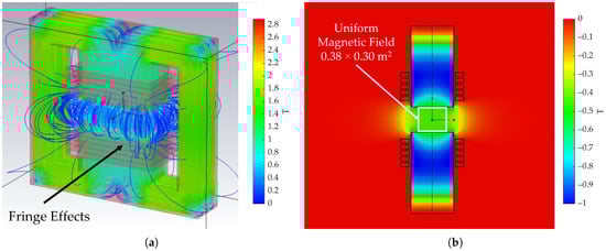 The test assumes that the applied magnetic field is uniform across the setup and oriented orthogonally to the goniometer axis. To validate this assumption, electromagnetic simulations of the MNP17 magnet were carried out using CST Studio Suite® 2022 (Dassault Systèmes, Vélizy-Villacoublay, France). As illustrated in Figure 4, the planar pole surface (1 m × 0.5 m with a 0.3 m gap) ensures negligible fringe effects at the center (Figure 4a). Fringe effects refer to the non-uniformities of the magnetic field that occur near the edges of the magnet poles, where the field lines spread outward rather than remaining parallel. Figure 4b shows that the volume characterized by uniform field intensity extends beyond the apparatus dimensions (0.15 m × 0.15 m × 0.25 m), thereby supporting the validity of the uniform-field assumption within the measurement region. In addition, a point measurement was taken at the motor location using a Hall probe to verify field magnitude before data acquisition. All components of the test apparatus are made of materials that are expected not to affect the local magnetic field within the measurement region occupied by the motor, further supporting the assumption of a uniform field.