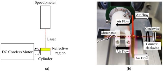 Figure 6 illustrates the methods adopted for measuring the motor angular speed. Measurements were performed using an optical speedometer and a lightweight plastic cylinder with a reflective band attached to the motor shaft (Figure 6a). This configuration enabled accurate measurements while minimizing additional loads on the shaft. The optical speedometer, however, provided only absolute values of angular speed, as it always returned positive values regardless of whether the motor rotated clockwise or counterclockwise. To overcome this limitation, an alternative method was implemented during selected tests: a propeller was mounted on the motor shaft so that the airflow it generated allowed identification of the rotation direction and detection of possible angular speed reversals (Figure 6b).