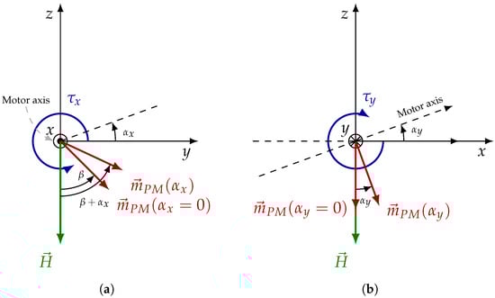 Reference frames employed for torque analysis. (a) Axial configuration: motor rotation around the x-axis by angle , yielding the magnetic dipole moment . (b) Transversal configuration: motor rotation around the y-axis by angle , yielding the magnetic dipole z-component .