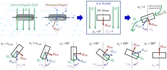 Graphical and qualitative representation of the torque trends of a DC motor immersed in a uniform external magnetic field, showing the effect of the permanent magnet dipole and the dipole resulting from the magnetization of the motor housing.