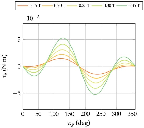 In this configuration, the motor exhibits two magnetic dipoles: , associated with the permanent magnet, and , generated by the magnetization of the motor housing. Their vector sum defines the effective magnetic dipole of the motor, . As the rotation continues, at the dipole aligns with the external magnetic field, producing zero torque along the y-axis and explaining the equilibrium point shown in Figure 8. For , the torque along the y-axis changes sign and therefore direction, reaching its maximum magnitude near . Beyond this point, the torque decreases and becomes zero at . In this condition, the contribution of the housing is cancelled, as the external magnetic field no longer has a preferential direction to channel through the material. Consequently, the motor’s magnetic dipole coincides with that of the internal PM.
