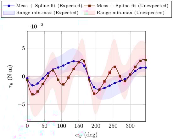 Torque as a function of the shaft angle under external magnetic fields. The blue curve represents the expected behaviour, showing the raw mean torque values across all magnetic fields applied (markers), the spline interpolation of the mean values (solid line), and the corresponding min–max torque range (shaded area). The red curve represents the unexpected behaviour, following the same graphical conventions.