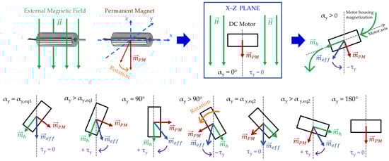 From Equation (2), it can be observed that since the PM is oriented perpendicular to the motor axis, which coincides with the x-axis, the x component of the magnetic moment is zero. When the motor rotates by an angle around the x-axis, the magnetic dipole moment undergoes the same rotation. Consequently, forms an angle of with the magnetic field vector .