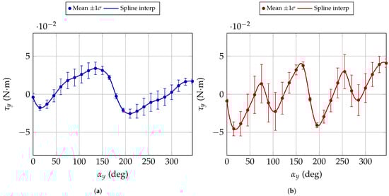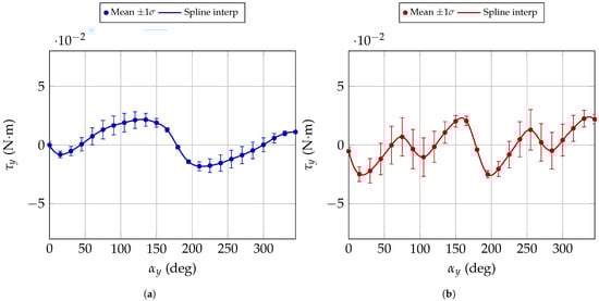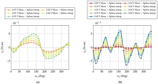 Torque measurements as a function of the motor axis orientation with respect to the magnetic field when the motors are switched off. Markers represent the measured data while solid lines correspond to the spline interpolations. (a) Expected behaviour. (b) Unexpected behaviour.