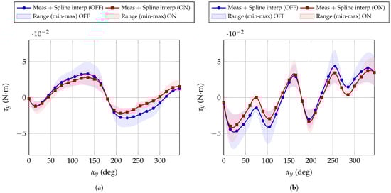 Comparison between motor OFF and motor ON conditions. Markers represent the measured data, solid lines the corresponding spline interpolations, and the shaded areas indicate the torque range observed within the magnetic field interval 0.15–0.35 T. (a) Expected behaviour, (b) Unexpected behaviour.