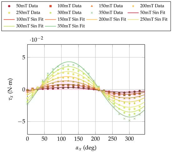 After observing the correlation between the displacement of the internal PM and the resulting torque, the axial motor holder was designed to directly detect these effects. In this configuration, secondary effects are negligible. Only the interaction between the external magnetic field and the motor PM is expected to play a role. This is because the motor shaft is parallel to the goniometer’s rotation axis (Figure 7a), and therefore the induced dipole moment due to this orientation relative to the vertical magnetic field is negligible. This effect is also illustrated in Figure 9 and Figure 12, for the case . As a result, the contribution of the motor cover is removed by the axial holder, while keeping the motors switched off prevents additional disturbances. Figure 17 shows the measured torque as a function of the motor axis orientation within magnetic fields ranging from 0.05 T to 0.35 T. According to the theoretical relation given by Equation (3), the torque originates solely from the interaction between the internal permanent magnet and the external magnetic field. Each curve in Figure 17 was fitted with a sinusoidal function to evaluate the deviation from the ideal sinusoidal behaviour expected for a fixed dipole. The fitting model adopted was: