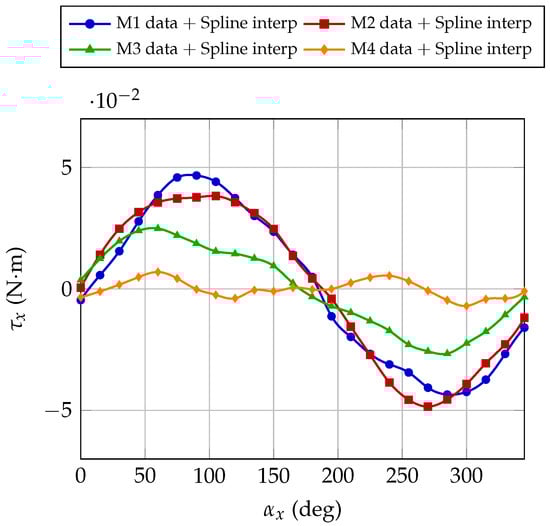 Figure 11 summarizes the experimental tests performed on 10 motors. The tests include transversal motor holder configuration and both motor ON/OFF conditions, under external magnetic fields ranging from 0 to 0.4 T. The markers represent the mean torque values computed across all tested magnetic field intensities (from 0 to 0.4 T) for each sampled angular position, taken every 15°. The continuous lines represent spline interpolation of these averaged data. Overall, the measured torque oscillates as a function of the shaft angle under the applied constant magnetic field, with magnitudes generally confined within N·m.